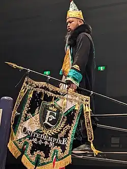 On January 4, 2023 at Wrestle Kingdom 17, O-Khan entered the New Japan Rambo, lasting till the final 4 and advancing to the four-way match the following day, for the Provisional KOPW Championship.[29] The following day at New Year Dash, O-Khan failed to win the Provisional KOPW Championship, after the four-way match was won by Shingo Takagi, with the match also including Toru Yano and Sho.[30] Later that month, O-Khan faced Takagi for the provisional title, at The New Beginning in Nagoya, losing in a Mixed Martial Arts rules match.[31] In March, O-Khan entered the New Japan Cup tournament, receiving a bye to the second round, although he lost to David Finlay.[32] Later that month, O-Khan successfully defended the Undisputed British Heavyweight Championship against Ricky Knight Jr.[33] In June at Dominion 6.4 in Osaka-jo Hall, O-Khan teamed with Aaron Henare in a three-way tag-team match for both the IWGP Tag Team Championships and the Strong Openweight Tag Team Championships, which were both vacant. The match was won by Bishamon (Hirooki Goto and Yoshi-Hashi).[34] In July, O-Khan lost the Undisputed British Heavyweight Championship to Michael Oku, ending his reign at 204 days.[35] The following week, O-Khan entered the G1 Climax tournament, participating in the B Block.[36] O-Khan finished the tournament with 6 points, failing to advance to the tournament's quarterfinals.[37] O-Khan attacked Takagi, during a post-match interview, before forcing him to lick his boots, as he promised an "execution" at the hands of the United Empire. On September 24 at Destruction, O-Khan was defeated by Takagi.