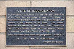 John Menadue, a former Ambassador to Japan, commented: "In his very direct way, Tony focused on the power of symbols and used them more effectively than any other person. He was the first to see a means to meet the need for reconciliation and forgiveness after the bitter war years and he became the heart and soul of it".[8] Another friend, the author Morris West, said: "He believed what he taught [as a Marist missionary] and taught by his own example the essential message of the Gospel: reconciliation and love".[9] Fr Paul Glynn, who has likewise been honoured for his achievements as a missionary and author, recalled: "Tony told me there is no cheap grace. We must struggle and sometimes suffer if we and others are to experience Christ's grace in ourselves and in those for whom we are responsible."
