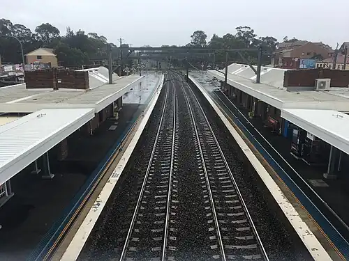 The station was rebuilt in the 1940s when the Main Western line was quadrupled.[6] In 2018, work was completed on an accessibility upgrade which like its neighbouring stations Pendle Hill and Wentworthville included a new concourse, footbridge and lifts as part of the Station Accessibility Upgrade Program.[7]