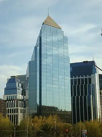 Inaugurated in 1992 for the Sociedad de Fomento Fabril (Sofofa), the building was the initial skyscraper in that part of Santiago and, after completion, became the highest structure in the city. Erected on the former CCU property, this tall building has a triangular shape with angled corners, housing a sturdy core in the middle that holds two sets of four elevators and two stairways. The double-height entrance hall on the ground floor is surrounded by two premises with separate access from the Costanera.[4] The tower takes full advantage of the site's potential for occupancy by reaching all the way to the ground, and the metal pyramid on top of the complex houses the necessary technical components for the building's functionality.[5]