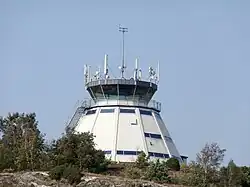 In 1969, an air traffic control tower was built on an adjacent hilltop as replacement for an older tower built in 1938. The same year a new terminal building (57°42′37″N 11°46′48″E / 57.71032°N 11.78008°E) was built next to the old one from 1938 (57°42′39″N 11°46′51″E / 57.71097°N 11.78095°E).
