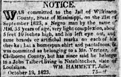 - ^ "fifty dollars reward". Natchez Gazette. May 27, 1820. p. 4. Retrieved 2024-08-17.