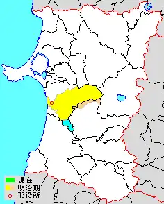 Location of former Kawabe District in Akita Prefecture; Yellow=original extent, Blue=portion annexed to Kawabe at a later date