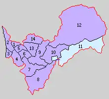 Historic Kawabe District – 1.Ushijima 2.Araya 3.Hamada 4.Toyoiwa 5. Niida 6.Yotsugoya 7.Kawazoe 8.Nakagawa 9.Toyoshima 10.Wada 11.Funaoka 12.Iwamisannai 13.Kami-Kitade 14.Shimo-Kitade Purple:Akita City Light Blue:to Daisen City