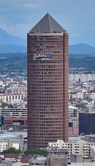 The Tour Part-Dieu (formerly Tour du Crédit Lyonnais, or colloquially Le Crayon, or The Pencil) is a skyscraper in Lyon, France. The building is 164.9 metres (541 ft) tall, in La Part-Dieu district, with 42 floors.[1] The building was completed in 1977. It currently stands as the thirteenth-tallest building in France. The top 10 floors are occupied by Radisson Blu Hotel Lyon, the highest hotel in Europe. The other floors are offices.