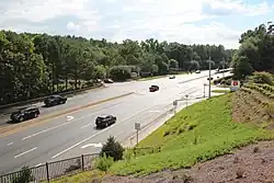 Towne Lake Parkway Forermerly known as West Church from Main St. To I-575 Interchange (used to be a two way street down to Mill street, now it's westbound only) begins at Main Street as a continuation of Arnold Mill Road, and goes west to a diamond interchange with I-575. Between Main Street in Woodstock and the Woodstock Parkway intersection, the road is two way traffic with one lane in each direction. Mill Street was intended to have been a split route carrying eastbound traffic through downtown while westbound remained on Towne Lake, but the development of Downtown Woodstock prevented this configuration from being completed east of Main Street and the railroad tracks.