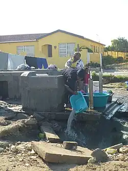 A consequence of inadequate pumping infrastructure and large populations is that the water pressure in the townships is very low. Each section of the townships normally has one pump per section. The water is used for everything from washing clothes to cooking, drinking, bathing, and cleaning the house. Having limited water accessible to each section makes it very hard to meet the daily water needs per household.[5]