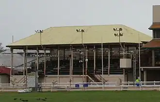 Tenders for the grandstand were called in February 1901. The grandstand, 96 feet (29 m) in length and 47 feet (14 m) deep was to be erected on a mound 176 feet (54 m) long and 40 feet (12 m) deep. The gentle rise to the building was designed to have no steps with seats rising in tiers from the ground in front of the grandstand. In the centre was a stairwell leading down below the stand and giving access to the luncheon room below. A bar, kitchen, lavatories and rest room were accommodated in this sub-floor. Bricks were used to support the foundations and retaining wall of the building with timber and iron used for the superstructure. To make good use of the prevailing breeze it was proposed the building face east–west and incorporate louvres on the top tier to the roof. Incorporating a decorative balustrade, the structure was designed to accommodate up to 1000 persons.[1]