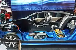 The Mirai is based on the Toyota FCV-R (Fuel Cell Vehicle) concept car, which was unveiled at the 2011 Tokyo Motor Show[17][18] and the Toyota FCV (Fuel Cell Vehicle) concept car, which was unveiled at the 2013 Tokyo Motor Show.[19] The unveiled FCV concept was a bright blue sedan shaped like a drop of water "to emphasize that water is the only substance that hydrogen-powered cars emit from their tailpipes." The FCV has a large grille and other openings to allow cooling air and oxygen intake for use by the fuel cell. According to Toyota, the FCV concept is close in appearance to the expected production version of the car.[20] The FCV size is similar to the Camry.[21] The FCV range is expected to be approximately 700 km (430 mi) under Japan's JC08 test cycle.[22]
