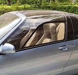 The rear hatch is constructed of a single piece of glass without a supporting steel frame. This, in combination with a steeply sloping front windscreen and glass upper-door/roof panels (a total of six separate glass pieces overall), gives the Sera its distinctive canopy and provides expansive visibility, although the thick B-pillar create a significant blind spot, especially on the driver's side. To deal with its high solar load, air-conditioning and twin removable interior roof panels are standard.