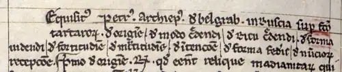 The first letter is from a bishop of Hungary and recounts his interrogation of two Mongol captives. It probably dates to 1239–1240. It was also incorporated into the Waverley Annals and was among the Additamenta ("additions") appended by Matthew of Paris to his Chronica. In the Courtenay Compendium and the Gonville and Caius manuscript, it appears under the heading Anno domini millessimo ccmo xliv transmissa est haec prelato parisius de adventu Tartarorum ("in the year of the Lord 1244 this [letter] concerning the advent of the Tartars was sent to the bishop in Paris").[28]