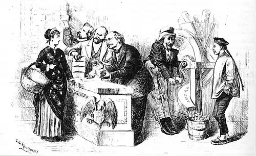 Linderman ordered a review of the success of the trade dollar in China.[26] It was discovered that the coins circulated reasonably well in southern China, but usage in the north was limited.[26] One reason the trade dollar succeeded, for a while was due to a shortage of Mexican dollars due to civil unrest in that country. After the Mexican mints were able to ramp up production again then the U.S. trade dollar fell to the wayside as it was well-known and preferred in China.[37] As the price of silver decreased, employers in the United States began paying workers in trade dollars purchased at a discount.[38] The situation frustrated the public, as the coins were widely disliked (and demonitized in 1876) and many banks and businesses refused to accept them.[38] In response, many towns, mostly in the western states, set a fixed value on trade dollars.[38] Businesses which did accept trade dollars to avoid offending customers could not deposit them in banks or use them to pay taxes, and sold them to brokers. The brokers in turn recirculated the coins by selling them at a discount from face value to employers who included them in workers' pay packets. In 1883, members of the New York Mercantile Exchange petitioned Congress to allow redemption of the coins by the government.[39][40]