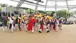 Nongak (농악) refers to "farmers' music" and represents an important musical genre which has been developed mainly by peasants in the agricultural society of Korea. The farmers' music is performed typically in an open area of the village. The organization of nongak varies according to locality and performing groups, and today there are a great number of regional styles and involvement of many instruments. Since Nongak involves in many types of dances and formation changes, the dancers and players have several types of artistic format due to their level of skill.[41]