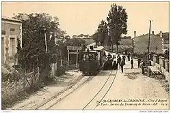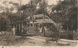 Southern terminus of the forest railway. Passengers could change to the steam tramway here. There were no direct trains (without changing at La Grande Côte) from La Coubre or Ronce-les-Bains to Royan. Although the lines were connected by a switch that was normally padlocked, the tracks were several dozen metres apart.[18] The petrol railcars were too weak on the mountainous routes of the steam tramway and the steam locomotives could not be used in the forest areas due to the risk of forest fires.