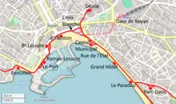 ^Route map: Casino Municipal, Grand Hôtel, Le Paradou, Parc Façade, Vallieres und St Georges Port and Le Paradou, Parc Oasis, Rav de Belmont, Parc des Sports, Le Coca und St Georges de Didone