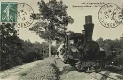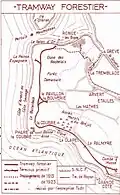 The metre-gauge forest railway originally started at the La Combe à Massé quarry in 1868. Initially used mainly by workers and employees for silvicultural work, the forest railway was also used by summer visitors after reforestation was completed. In the newspaper Le Gaulois of 21 July 1884 and 11 August 1884, an advertisement appeared for "visits by forest railway to La Palmyre, La Coubre, the Pavillon Bonne-Anse, the Pointe Espagnole, the Galon d'Or, the forest and dolmens of Combots, the forest of Arvert, etc."[4][17]