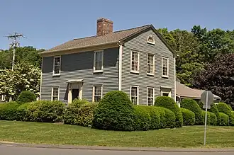 The Treadwell House stands in the village center of Burlington, on the east side of its triangular green, between George Washington Turnpike and Spielman Highway (Connecticut Route 4). It is a 2+1⁄2-story wood-frame structure, with a gabled roof, central chimney, and clapboarded exterior. Its primary facade faces south toward the turnpike, while a secondary facade faces west to the green, with the roof ridge oriented north–south. The south facade is three bays wide, with the main entrance in the right bay. The door and windows are framed by modest mouldings, and there is a half-round opening (presently filled with a louver, but originally with a window) in the gable above. The west facade is also three bays wide, with a more elaborate but false entrance at its center, framed by pilasters and topped by an entablature and cornice. A modernized ell extends eastward from the main block.[2]