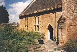 The kitchen block was added in the late 15th century or early 16th century and has no direct connection with the rest of the house.[8][10] The Solar Block is the oldest part of the building dating from around 1250.[11][6] It has a plate tracery window with a Trefoil cusping surrounded by wall paintings.[12] The solar separated from the hall by a screens passage.[10]