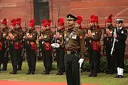 The Tri-Services Guard of Honour (त्रि-सेवा सम्मान गार्ड) is an ad hoc infantry company of the Indian Armed Forces which is responsible for providing guards of honour for high ranking Indian and foreign officials. The company was created shortly after India gained its independence from the United Kingdom in 1947. It is headquartered in New Delhi and is composed of 100 men and women who are drawn from the three services of the Indian Armed Forces (Indian Army, Indian Navy and Indian Air Force).[1] The guard excludes the Indian Coast Guard in any of its protocol events.