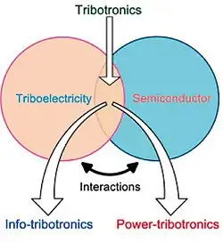 Tribotronics is about the research on interaction between triboelectricity and semiconductor, which is using triboelectric potential controlling electrical transport and transformation in semiconductors for information sensing and active control (info-tribotronics), and using semiconductors managing triboelectric power transfer and conversion in circuits for power management and efficient utilization (power-tribotronics).[1]