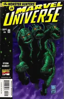 A Skrull named De'Lila arrived looking for the Inorganic Technodrome and took over Tricephalous and the other monsters causing them to go on a rampage.[6] When De'Lila is defeated, Tricephalous and the other monsters return to Monster Island with the Punisher on their trail. However, he abandons the chase after seeing the Fantastic Four.[7]