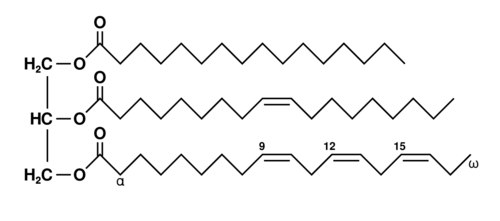 α-Linolenic acid (polyunsaturated, C18:3 cis-9,12,15, omega-3) |