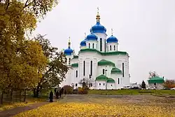 The Troieshchyna Cathedral is one of the largest Ukrainian Orthodox churches in Kyiv. It was built on the outskirts of Kyiv, in the former village of Troieshchyna, between 1991 and 1997. The penticupolar church is dedicated to the Holy Trinity. A huge bell tower stands nearby. The style is that of a traditional Ukrainian Baroque cathedral.