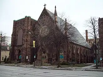Trinity Episcopal Church is a historic Episcopal church complex located at Buffalo in Erie County, New York. The oldest part of the complex was built in 1869 as the Gothic Revival style Christ Chapel; it was later redesigned in 1913. The main church was constructed in 1884 in the Victorian Gothic style and features stained glass windows designed by John LaFarge and Tiffany studios. The parish house, designed by Cram, Goodhue & Ferguson, was constructed in 1905.[2]