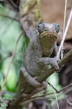 Trioceros johnstoni, known commonly as Johnston's chameleon, Johnston's three-horned chameleon, and the Ruwenzori three-horned chameleon, is a species of chameleon, a lizard in the family Chamaeleonidae.[3] The species is endemic to highlands in the Albertine Rift in central Africa.[1] It reaches up to 30 cm (12 in) in total length (including tail). Only the adult male has three horns. The female is hornless.[4]
