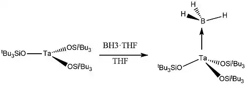 Upon reacting tris(silox)Ta with excess borane–tetrahydrofuran (BH3·THF), tris(silox)·BH3 is obtained: