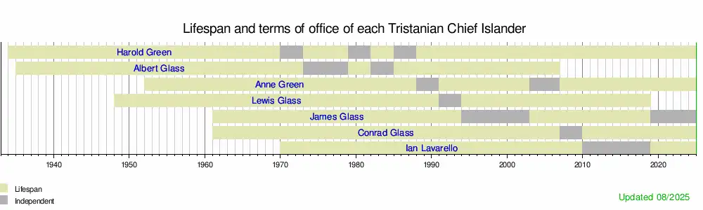 This is a graphical lifespan timeline of chief islanders of Tristan da Cunha. They are listed in order of first assuming office.