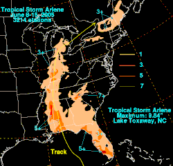 Upon making landfall, the storm produced storm tides of up to 3.9 feet (1.2 m) in height. Minor beach erosion occurred as well. Arlene dropped moderate to heavy rainfall throughout Alabama, with higher totals of up to eight inches (200 mm) to the west of Interstate 65. four to six inches (100 to 150 mm) of rain fell in a three-hour period in the Mobile area. Several roads were temporarily impassable from the flooding, and one road was completely washed away. Wind speeds were around 20 to 30 mph (30 to 50 km/h), while wind gusts of over 60 mph (95 km/h) existed. The winds downed several trees and power lines, leaving thousands without power for several hours. With the storm following a path similar to Hurricane Ivan just nine months earlier, many trees damaged previously by Ivan were downed completely. In addition, several homes experienced light wind damage. The outer bands of the storm also caused numerous funnel clouds, though no tornadoes were reported. Overall, damage was light, amounting to $1.7 million (2005 USD).[25]