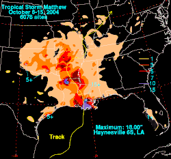 Tropical Storm Matthew was a weak tropical storm in 2004 that made landfall in Louisiana. It was the thirteenth tropical storm of the season and the ninth to affect the United States. It formed over the western Gulf of Mexico on October 8 and struck south-central Louisiana two days later. The combination of the storm and an upper cyclone over the southern Plains brought heavy rains to much of the Gulf Coast, with the highest amounts reported over 15 inches (380 mm) in northern Louisiana. Damage was minimal, totaling $305,000 (2004 USD), and no casualties were reported.