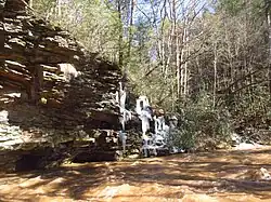 Trough Creek State Park is in the southern section of the Ridge and Valley region of Pennsylvania. Great Trough Creek carved a valley through the Broad Top in the Appalachian Mountains, which have been greatly reduced in size by the effects of wind and water erosion.[7] The bedrock formations within the park are (in ascending stratigraphic order): Devonian Catskill Formation, the Mississippian-Devonian Rockwell Formation, and the Mississippian Pocono Formation.[8]
