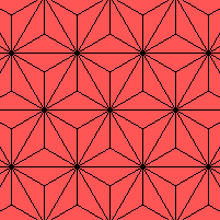 The triakis triangular tiling is a tiling of the Euclidean plane. It is an equilateral triangular tiling with each triangle divided into three obtuse triangles (angles 30-30-120) from the center point. It is labeled by face configuration V3.12.12 because each isosceles triangle face has two types of vertices: one with 3 triangles, and two with 12 triangles.