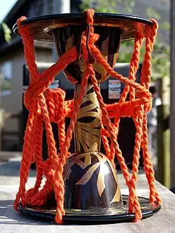 Each drumhead is crafted with a piece of foal skin sewn onto an iron ring. Then a thick layer of reinforcement is added on the back, and finished with urushi lacquer and gold leaves. The sew marks are also covered up with urushi lacquer, which provides both decoration and further reinforcement to the drumhead. In contrast, the drumheads used for the ōtsuzumi are made of thick horsehide, and are never decorated, as they are meant to be consumables. The wooden body is carved out from a single block of cherry wood, and is decorated with urushi lacquer and gold leaves in the maki-e style. The bodies are 25 centimeters in length.[2] The hemp cords were dyed previously in vermillion, although other dyes are used today due to its toxicity.