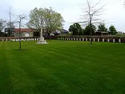 This cemetery's name means "tile factory", as it was begun in the grounds of a tile works in 1915.[2] The chimneys of the tile works were very visible and provided a means for the opposing side to calibrate their shells. This led to the cemetery itself being heavily shelled and the sites of most of the original graves were lost.[2][3] Most of the gravestones are positioned around the edges[2] of the otherwise empty-looking cemetery, and are marked "known to be buried in this cemetery", with the default additional phrase "Their glory shall not be blotted out", a line suggested by Rudyard Kipling.[4][5]