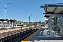 Tukwila station consists of two 600-foot-long (183 m) side platforms on an embanked, triple-tracked segment of the BNSF Seattle Subdivision.[3][4] The platforms have several covered shelters and are connected to ground level by stairs and ramps that lead towards a pedestrian underpass along Longacres Way at the north end of the station.[5][6] The station's ticket vending machines, bike lockers, and bus bays are located in a plaza west of the platforms.[7][8] The plaza also includes a piece of public art, Sheila Klein's sculpture and garden Imaginary Landscape, located at the station's ancillary building. It consists of planted red-twig dogwood shrubs, painted steel panels, and a steel "crown" atop the building.[9]