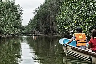 It is possible to navigate, by kayak or canoe, the waterways inside the mangrove forest in the zone accessible to tourists (137,5 hectares = 4,61% of the sanctuary).[2] In this area activities like walking on beaches, birdwatching and observation of the use of the mangrove ecosystem by the locals are also allowed.[2]