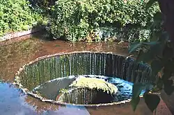 It is apparently a rare design in that the water enters through a circular opening at the top that is surrounded by the stream. The water then cascades down several smaller rings until it enters a culvert, which leads into a tunnel under the nearby path before sluicing down to the river a few metres away.