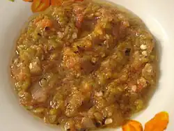 Tunisian cuisine, the cuisine of Tunisia, consists of the cooking traditions, ingredients, recipes and techniques developed in Tunisia since antiquity. It is mainly a blend of Arab, Mediterranean, Punic, and Berber cuisine.[1] Historically, Tunisian cuisine witnessed influence and exchanges with many cultures and nations like Italians, Andalusians, French and Arabs.[2]