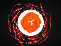 Unlike other North African cuisines, Tunisian food is quite spicy. A popular condiment and ingredient which is used extensively in Tunisian cooking, harissa, is a mix of ground chili peppers, garlic, and caraway[5] or spices commonly sold together as a paste. It is usually the most important ingredient in different sauces and gravies. Westernised harissa mostly contains red chilies to replace black cumin, which is different from standard cumin. Other common spices include cumin or cumin seeds, garlic, caraway seeds, coriander seeds and paprika. A recipe for the sauce includes red chili peppers and garlic, flavored with coriander, cumin, olive oil and often tomatoes. Harissa has been recognized on UNESCO's list of Intangible Heritage since 2022.[6]