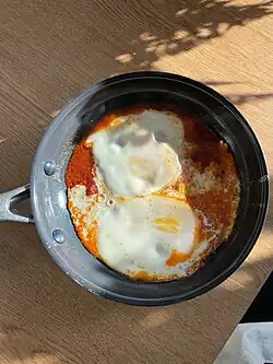 • Shakshouka—a dish of eggs poached in a sauce of tomatoes, chili peppers, and onions, often spiced with cumin. It is similar to, but not the same as, ojja (see above).