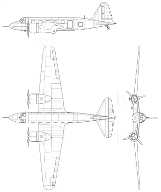 The ANT-35's cabin, with a headroom of only 1.68 m (5 ft 6 in), and further constricted by having the wing spars pass through it, was very cramped, and the second prototype, designated the ANT-35bis, had the fuselage height increased by 0.15 m (5.9 in), greatly improving space for the passengers, while two 750 kW (1,000 hp) Wright Cyclone G2 engines were fitted.[3][6] The ANT-35bis was completed in June 1937, and the type was put into production at Factory No 22 in Moscow, with production aircraft powered by Cyclones or the Soviet licence-built derivative, the Shvetsov M-62IR, with deliveries starting in 1938. By 1939, Soviet factories had begun license-building the Douglas DC-3 airliner, which used the same engines but could carry twice the passengers over a greater range and production of the ANT-35bis was stopped in 1939, with only nine aircraft (plus the two prototypes), completed.[7][4]