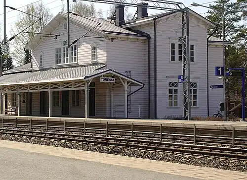 Turenki railway station was one of the first railway stations in Finland established on the country's first railway line in 1862. Originally Leppäkoski was considered as the place for a railway station, but in the end the station was established at Turenki and was one of the candidates to become the western terminus of the railway line to St. Petersburg[4] (which was eventually built starting from Riihimäki station instead).