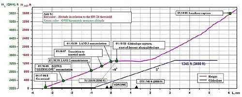 Since the aircraft was flying at an altitude higher than it was supposed to, its landing system was unable to catch the airport's glideslope signal properly. The system did capture a signal at 07:15 a.m and the pilots who noticed it immediately engaged the autoland system so they could land as soon as possible. Investigators noted that this was not the actual glideslope but in fact a false glideslope signal that should have not been used by the crew to land. The fake glideslope was captured at an angle of nine degree, while the actual glideslope was at three degree angle.[3]: 94–95