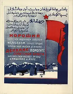 It's important to note that the need for refinement and standardization of Turkmen Arabic script was also recognized in the 1910s and 1920s in Russian Turkistan (Turkmen SSR from 1925). Thus, there was an earlier attempt at standardization of the Turkmen Arabic orthography too, with rules and vowel conventions similar to those used by other Turkic languages of Russian Turkistan, such as Kazakh and Karakalpak. This orthography was presented in the above comparison table, and its vowel convention explained in the above section. That orthography was discarded in 1929 as part of the process of Latinization.[4][6][7]