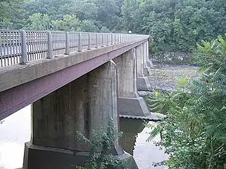 The current bridge is the second on this site. Previously, a suspension bridge constructed in 1871 and known as the "Lower Suspension Bridge" was located at the site.[1] The old bridge was constructed with funds from the towns of Greenfield and Montague and cost about $36,000.[2] A road connecting the bridge to Greenfield center was laid out by the following year.[3] The bridge was constructed primarily to allow laborers in Greenfield to easily go to the newly developing village of Turners Falls.[2] The previous bridge was severely damaged in the 1936 flood and the current bridge was constructed soon after.[1]
