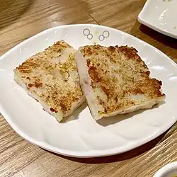 Turnip cake is commonly served in Cantonese yum cha, usually cut into rectangular slices and sometimes pan-fried before serving. Each pan-fried cake has a thin crunchy layer on the outside from frying, and is soft on the inside. The non-fried version is soft all over. It is one of the standard dishes found in the dim sum cuisine of China as well as in overseas Chinatown restaurants. It is also commonly eaten during Chinese New Year, since the word for radish (菜頭; chhài-thâu) is a homophone for "good fortune" (好彩頭; hó-chhái-thâu) in the Hokkien language.[1] In Taiwan, turnip cake is also commonly eaten as part of breakfast.