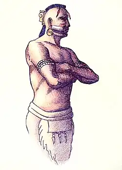 Moscoso and his men mounted their horses and galloped around the plaza, playing juego de cañas,[5] a dangerous sport involving jousting with lances. The men occasionally feinted toward Tuskaloosa, hoping to frighten him, a technique of manipulation de Soto had used against the Inca Atahualpa at Cajamarca. The chief sat unmoved. Afterward the Indians served the Spaniards food, and the residents of Atahachi danced in the plaza. This reminded the Spaniards of rural dances in their own country. When de Soto demanded porters and women from the chief, the chief said that he was accustomed to being served, and not vice versa. De Soto had Tuskaloosa taken hostage. The expedition began making plans to leave the next day, and Tuskaloosa relented, providing bearers for the Spaniards. He informed de Soto that they would have to go to his town of Mabila (or Mauvila)[6] to receive the women. De Soto gave the chief a pair of boots and a red cloak to reward him for his cooperation.[1]